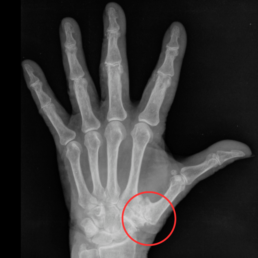 Come puoi osservare dall’immagine, la rizoartrosi è essenzialmente il risultato dell’usura della superficie articolare. Questa continua ad aggravarsi con il movimento, causando “attrito”, aumento dell’infiammazione e dolore.